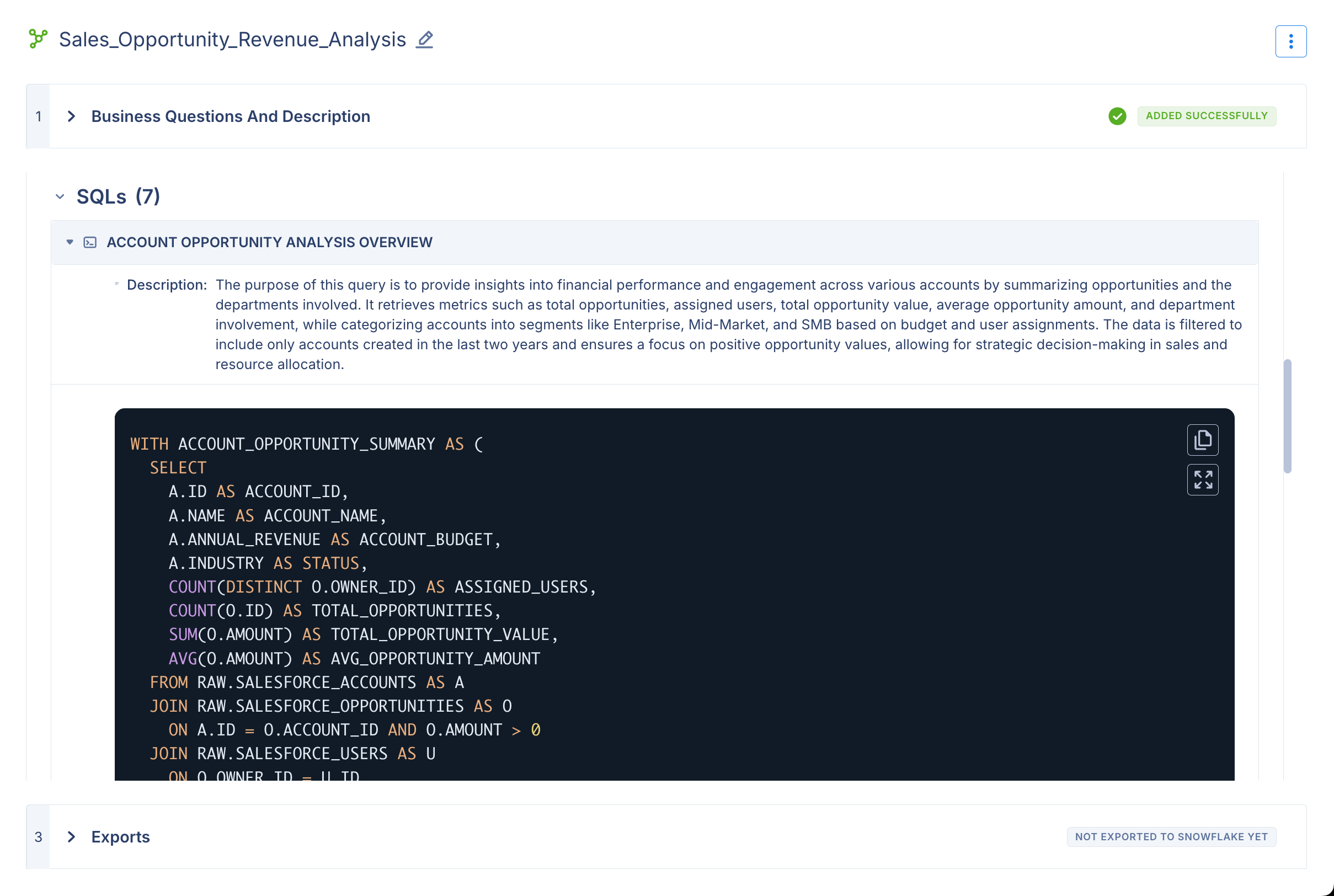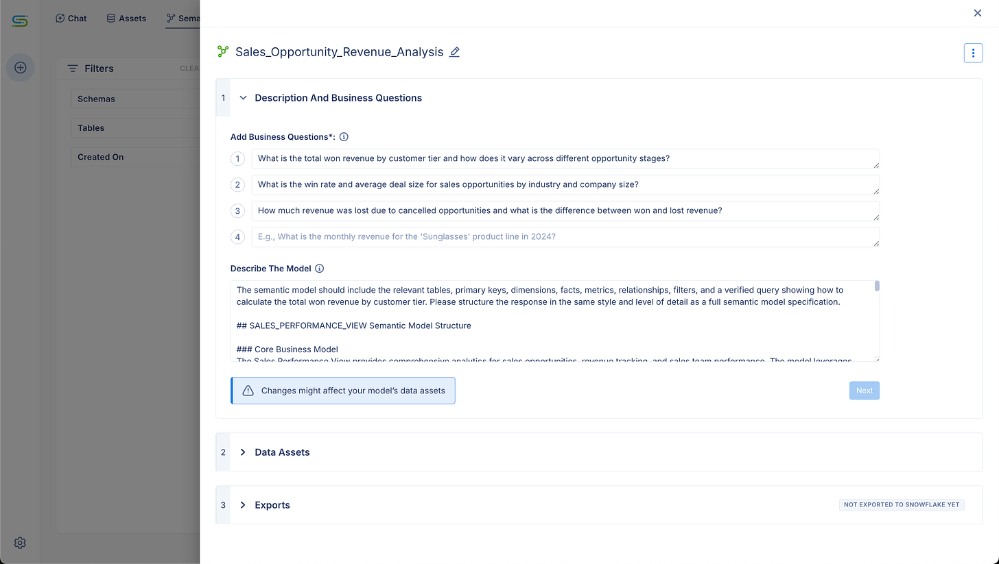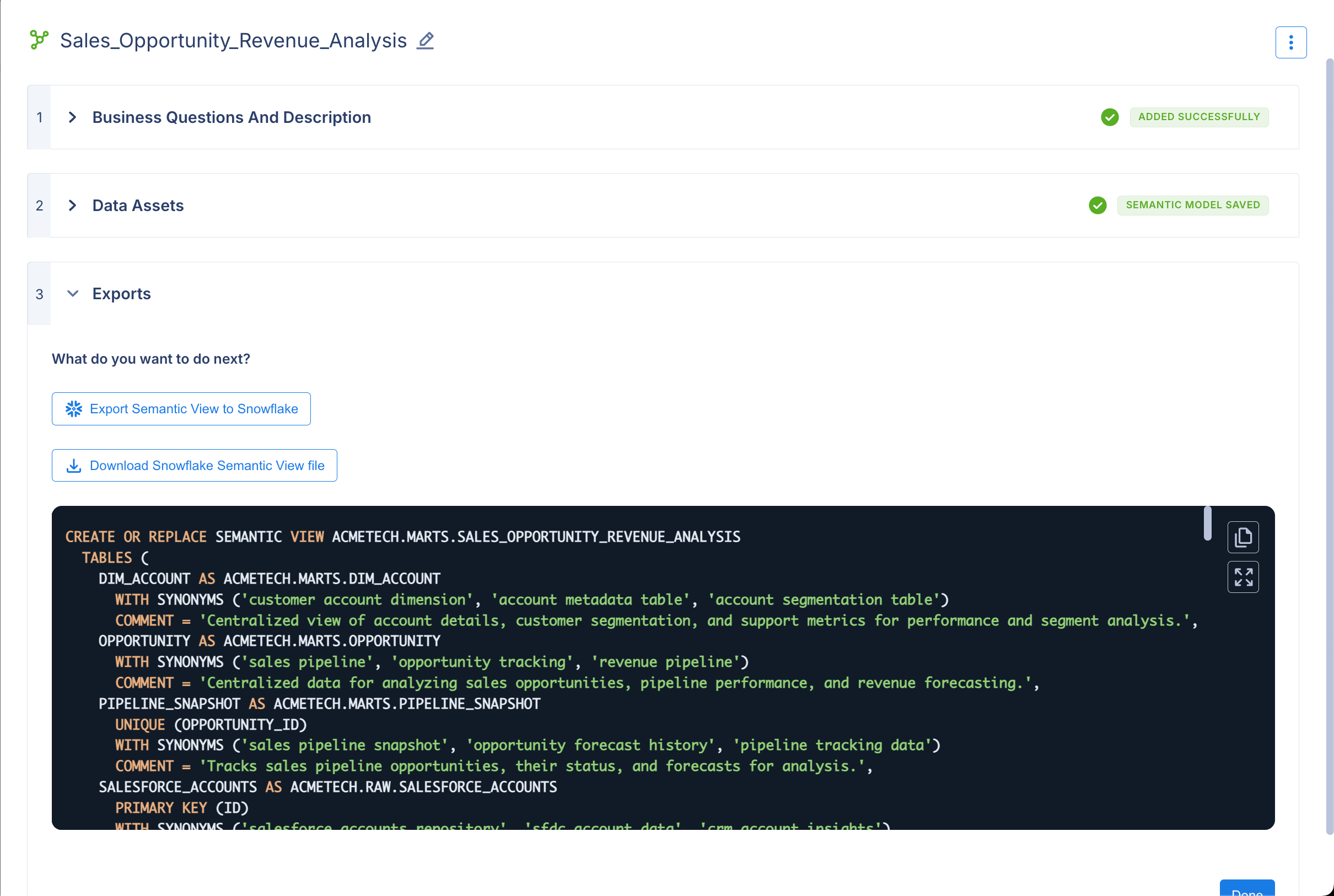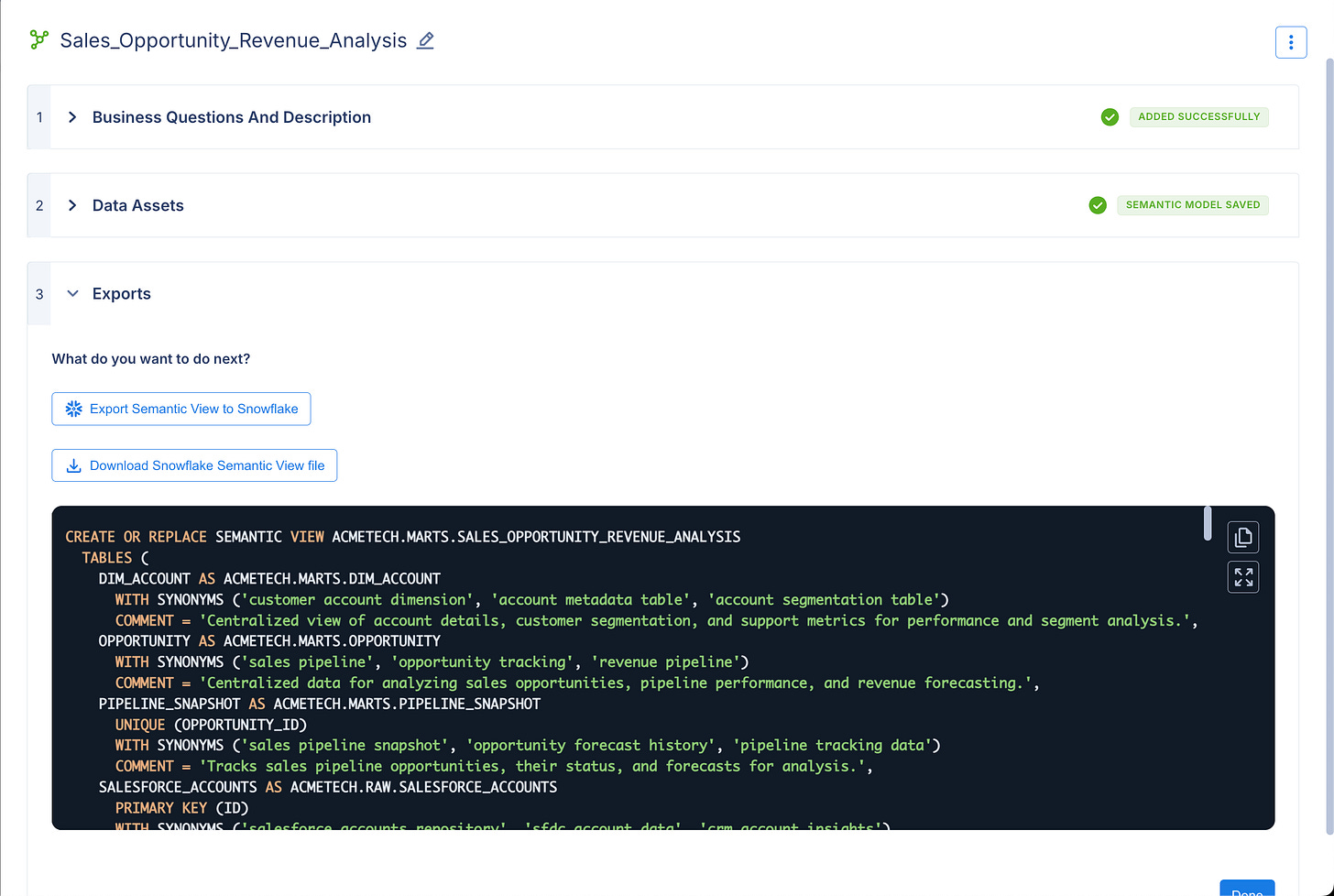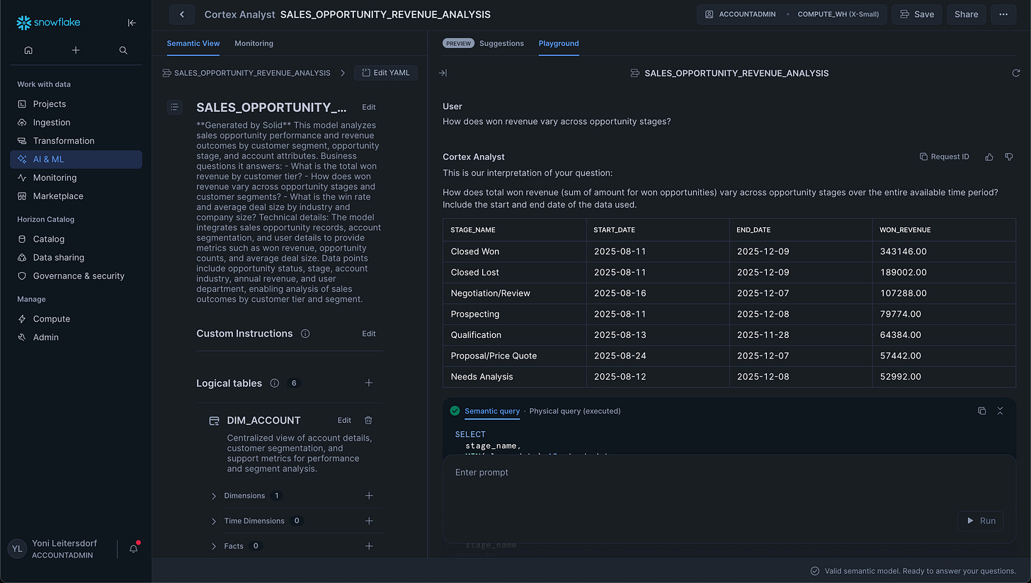 With a click of a button, Solid can push the semantic view out to Snowflake for testing. At this point, Solid can automatically test the view (by running relevant business questions through Cortex Analyst and evaluating the results), or the analytics engineer can do so manually.