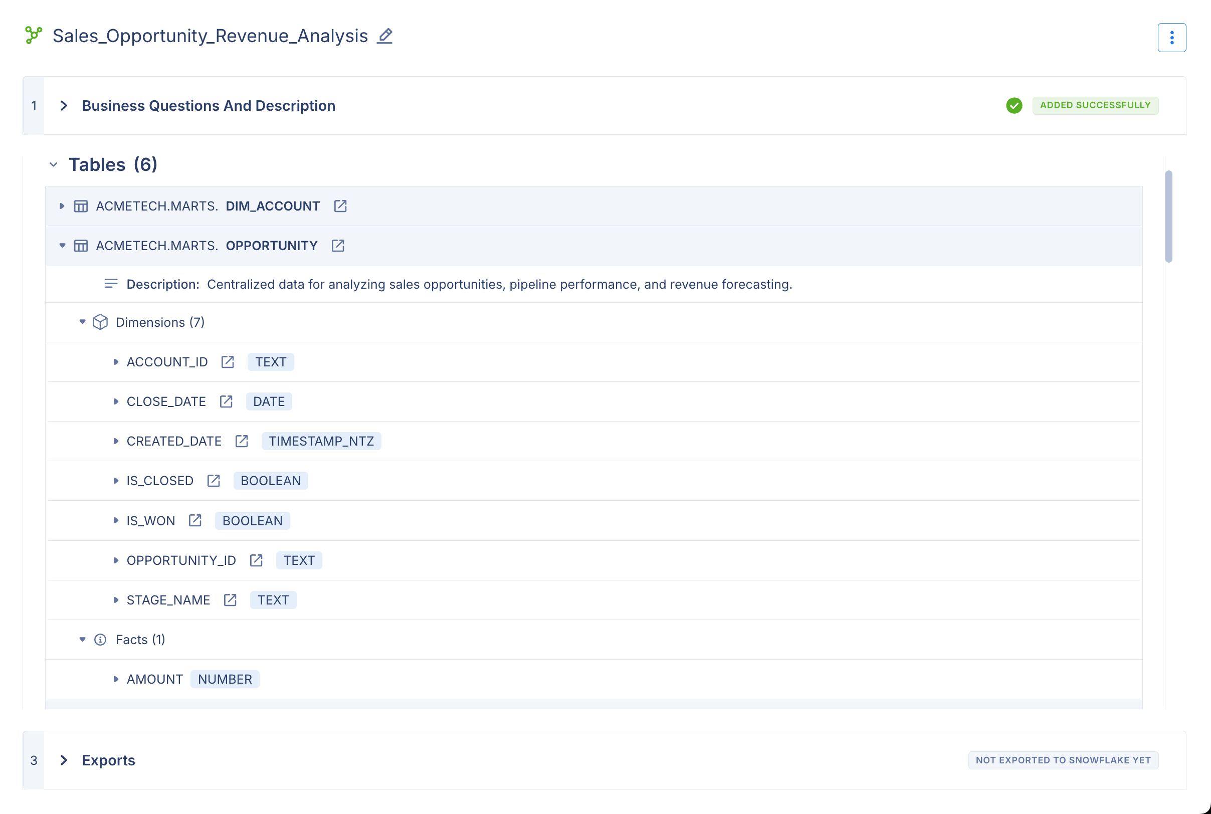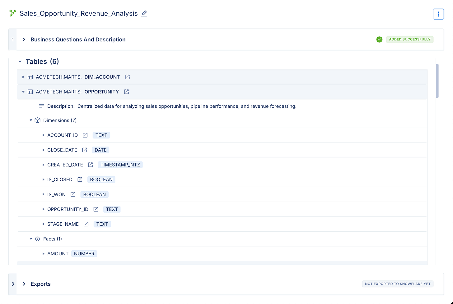 Now, we’ll click Next and give Solid thirty seconds to pick the right assets for the model. We can now see that Solid picked the correct tables (with their dimensions and facts), joins/relationships, metrics and verified SQL queries. These are all high quality assets, that have passed our rigorous filtering mechanisms (after all, there’s a lot of garbage in our Acme’s data warehouse).