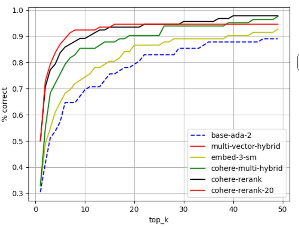 For example, this graph measures accuracy, and the engine’s ability to provide the right response within the first couple of options it shows the user (each option represents a different combination of embedding algorithm and reranker algorithm):