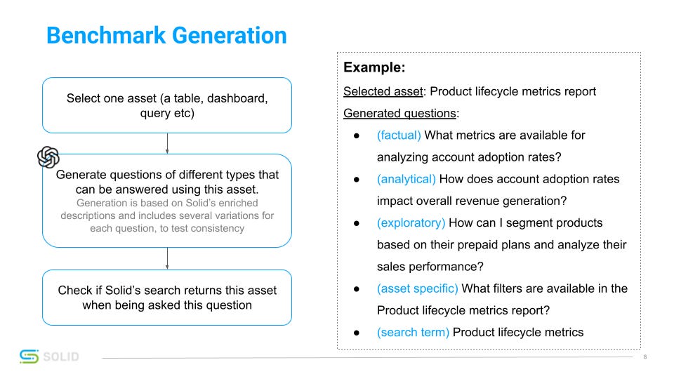 Another issue with synthetic tests is that while we look at an asset, generate synthetic tests for it, and run them through the engine, it’s possible that there is a better asset that answers the same question. For example, imagine we see an asset for “User Churn Reasons”, and the question we generate is “Where can I find user churn stats?”. It’s possible there’s an asset for “User Churn - Yearly Tracker” that is a better result for that question.
