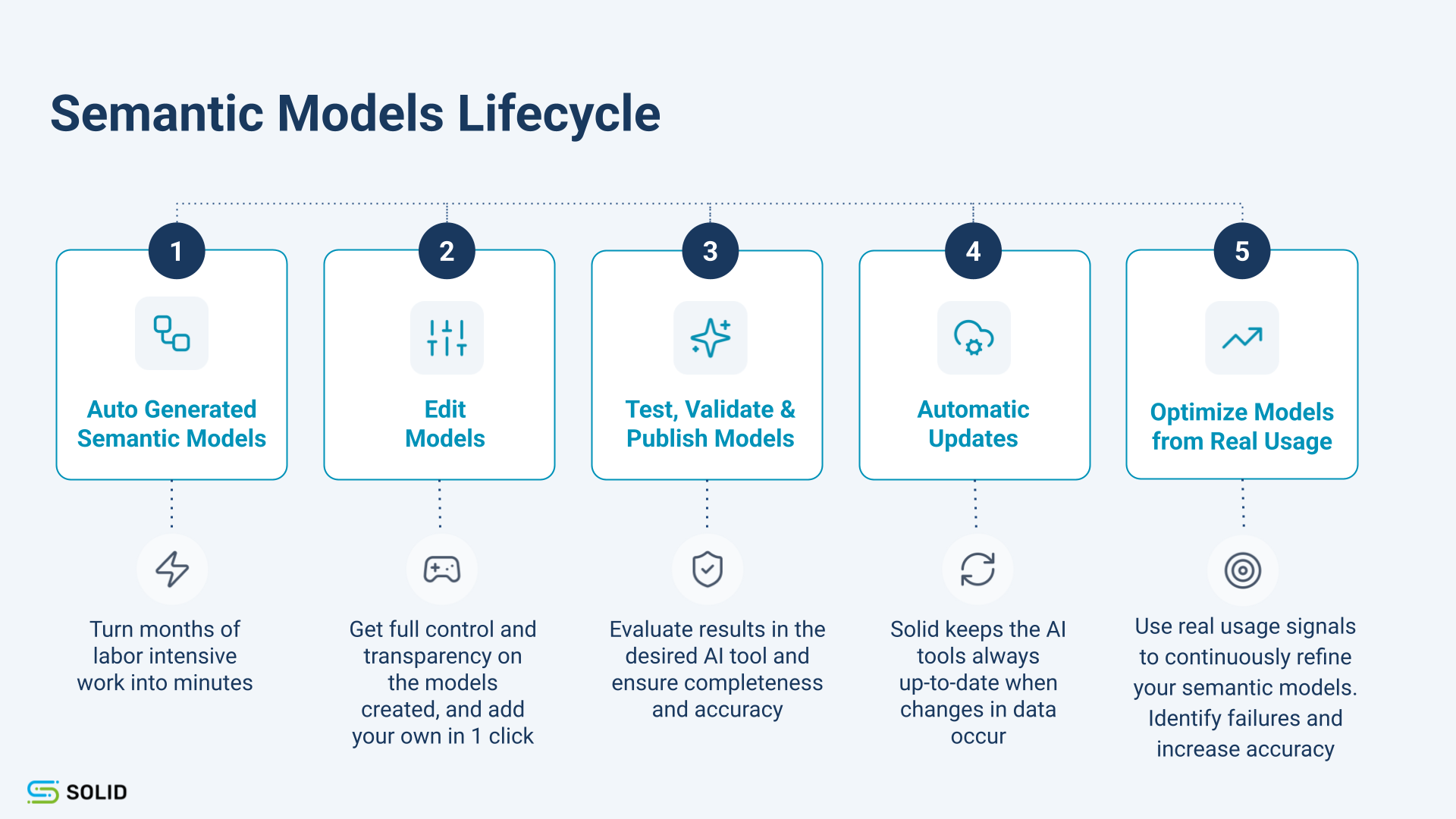 Publicly, that is exactly how we describe Solid Build: automatically turning warehouse usage, BI semantics, SQL query history, and metadata into semantic models; keeping them current as the data changes; letting teams review and approve them; and validating model logic before publication.