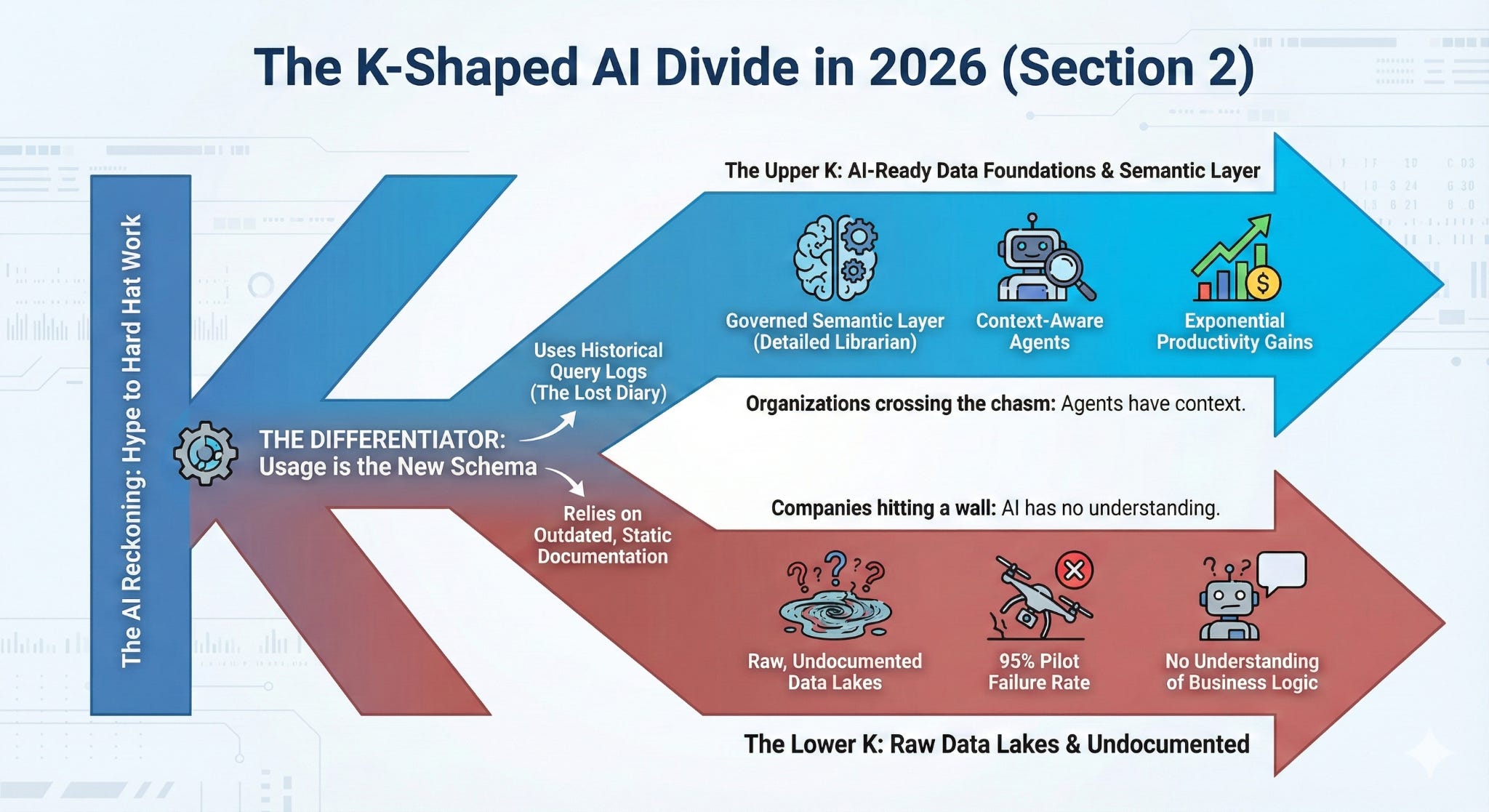 The Upper K: Organizations that invested in AI-Ready data foundations - specifically, a governed semantic layer that can educate the agents how to best use the data - are crossing the chasm. They are seeing exponential productivity gains because their agents have context.