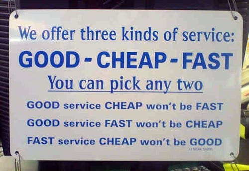 The cheap/fast/good triangle discussed in the above sign is well known at this point. I generally agree with what it says, with one exception: Major innovations allow for improvement across all three axes. You can get something better, and cheaper, and faster. You just need some revolutionary technology, ideally one that is only two letters and been all the rage recently.