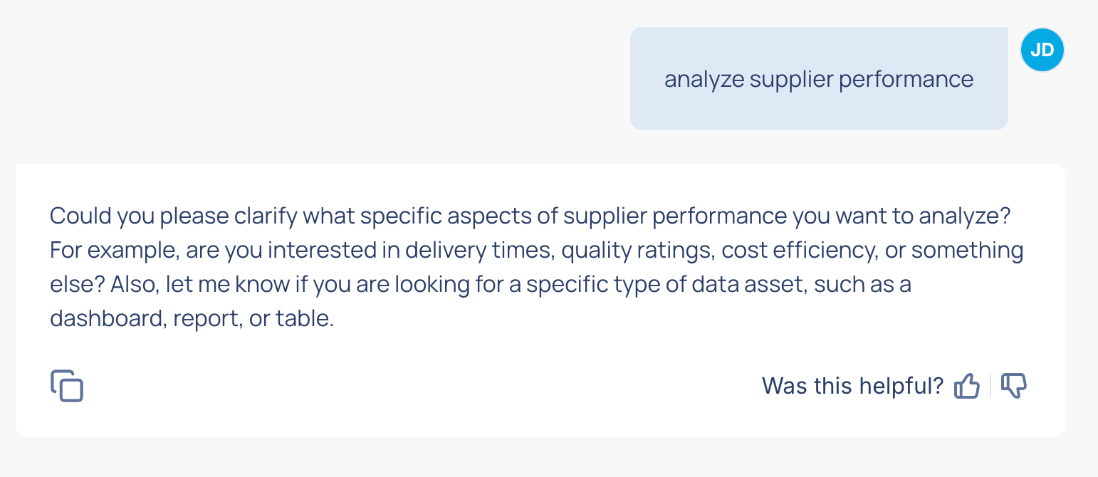 Unfortunately, sometimes, we don’t have enough information to be successful there. For example - is the user looking for a dashboard, or a query? If they are looking to analyze supplier performance, what metric are they looking to focus on?